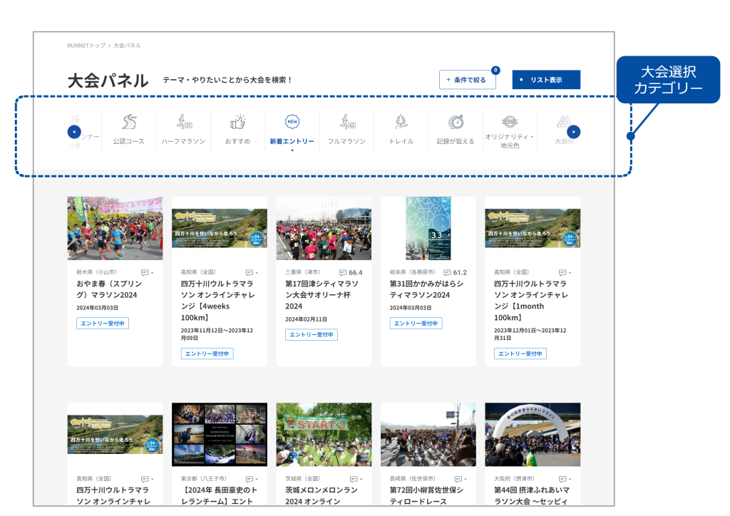 自身の志向にあった大会やユニークな大会に出会うためのツールとして『大会パネル』をリリースしました。【おもてなし】【自然満喫】【キッズ・ファミリー】【初心者向き】など、お好みのカテゴリーから大会検索が可能となります。これまでのユーザー動向の分析では、大会名や開催日を直接入力するピンポイント検索が多くを占めていましたが、「大会パネル」機能を使うことによって従来の条件指定では出会えなかった大会を、感覚的に楽しく探すことができます。(大会選択カテゴリーは22種類からスタート)