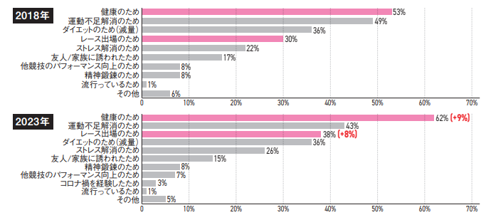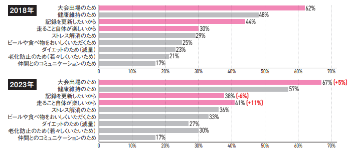 ・コロナ禍前(2018年)と比較、「健康のために走り始めた人」が9%上昇、「レース出場のため」が8%上昇。