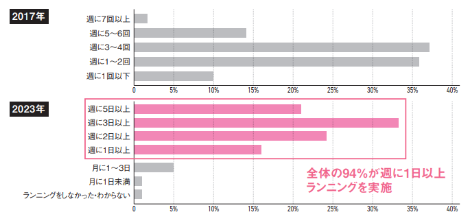 ランニングの実施頻度を問う設問では、週に1日以上実施する人が全体の94%を占めました。2017年と比較すると、週に1日(1回)以上実施する人は5%上昇しており、コロナ禍によって「走ることに向き合う時間が増えた」「走ることが習慣化した」ランナーの増加を示す結果となりました。