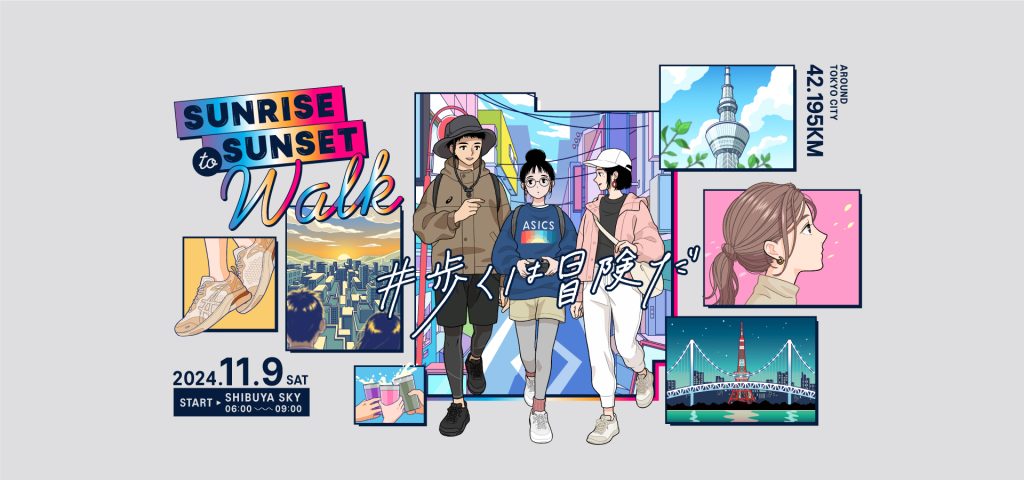 「Sunrise to Sunset Walk」は、朝の静けさ漂う渋谷から息を飲むような美しい朝日をバックにスタートし、原宿、秋葉原、浅草など1日を通じて東京の街並みを楽しみながらフルマラソン(42.195km)を歩くイベントです。スタートからフィニッシュまで、どの瞬間を切り取ってもこのイベントでしか味わうことが出来ない“体験”を提供し、イベントのフィニッシュには仲間とともに長い道のりを歩いた先にしかない、特別な達成感が待っています。